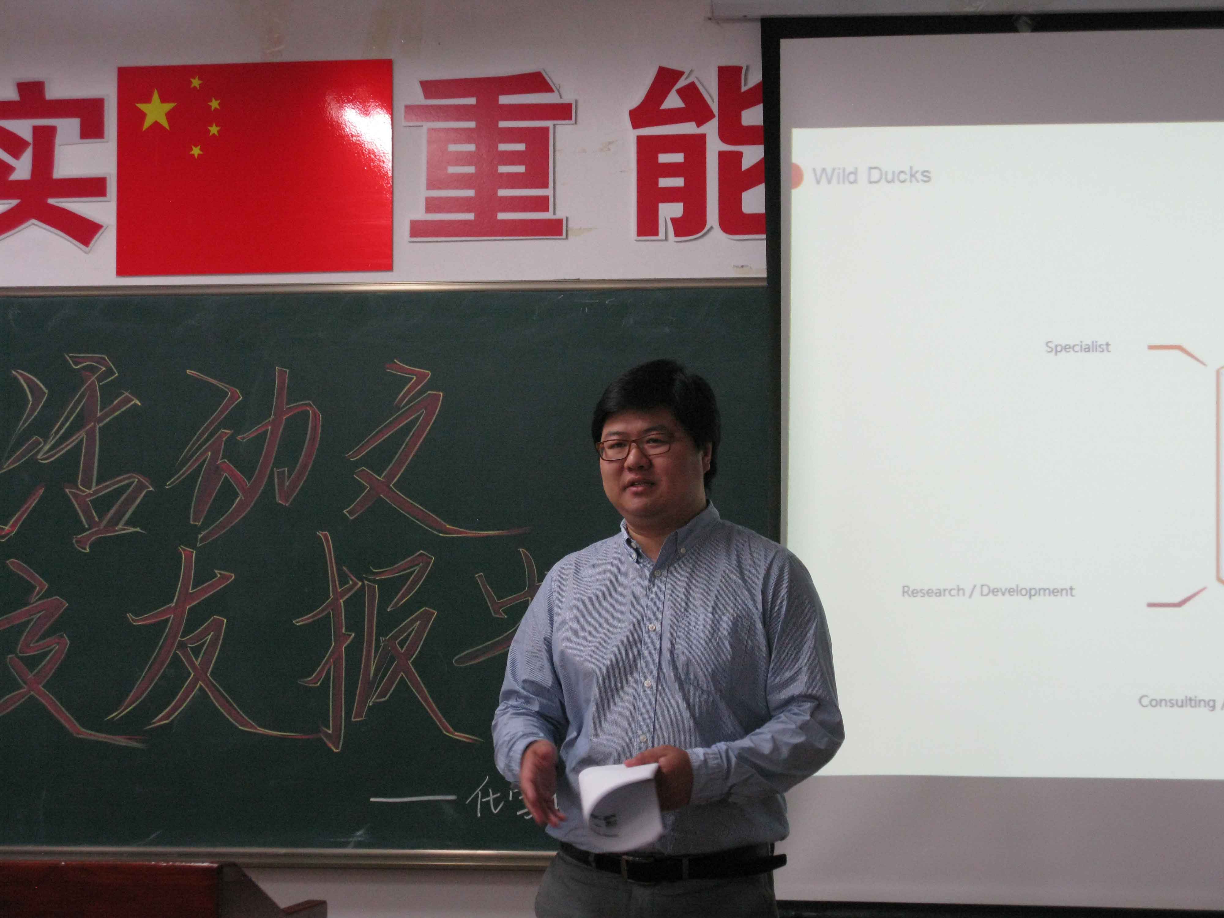 施阳校友以轻松的语气,向大家分享他的个人的经历和心得体会。全过程中用英文ppt对毕业求职的渠道,毕业简历的设计,到面试的技巧等等进行了细致的讲解,无不深深吸引每一位在座的学生。最后根据自身经验向大家分享了学习、工作生涯的重要8个字:激情、勤奋、冷静、自信。吕宜男女士也分享她的个人经历并播放辉瑞集团的发展史。在随后的提问环节,施阳校友热心细致的回答了同学们提出的每一个问题,并对提问的同学赠送了的精致礼物。接下来,王秋教授送给同学们三句箴言:一、机会垂青有准备的人;二、学习是一生的事情;三、迷茫的时候要做好眼前的事。这让许多同学受益匪浅。最后,杨梅院长代表足球分析论坛
