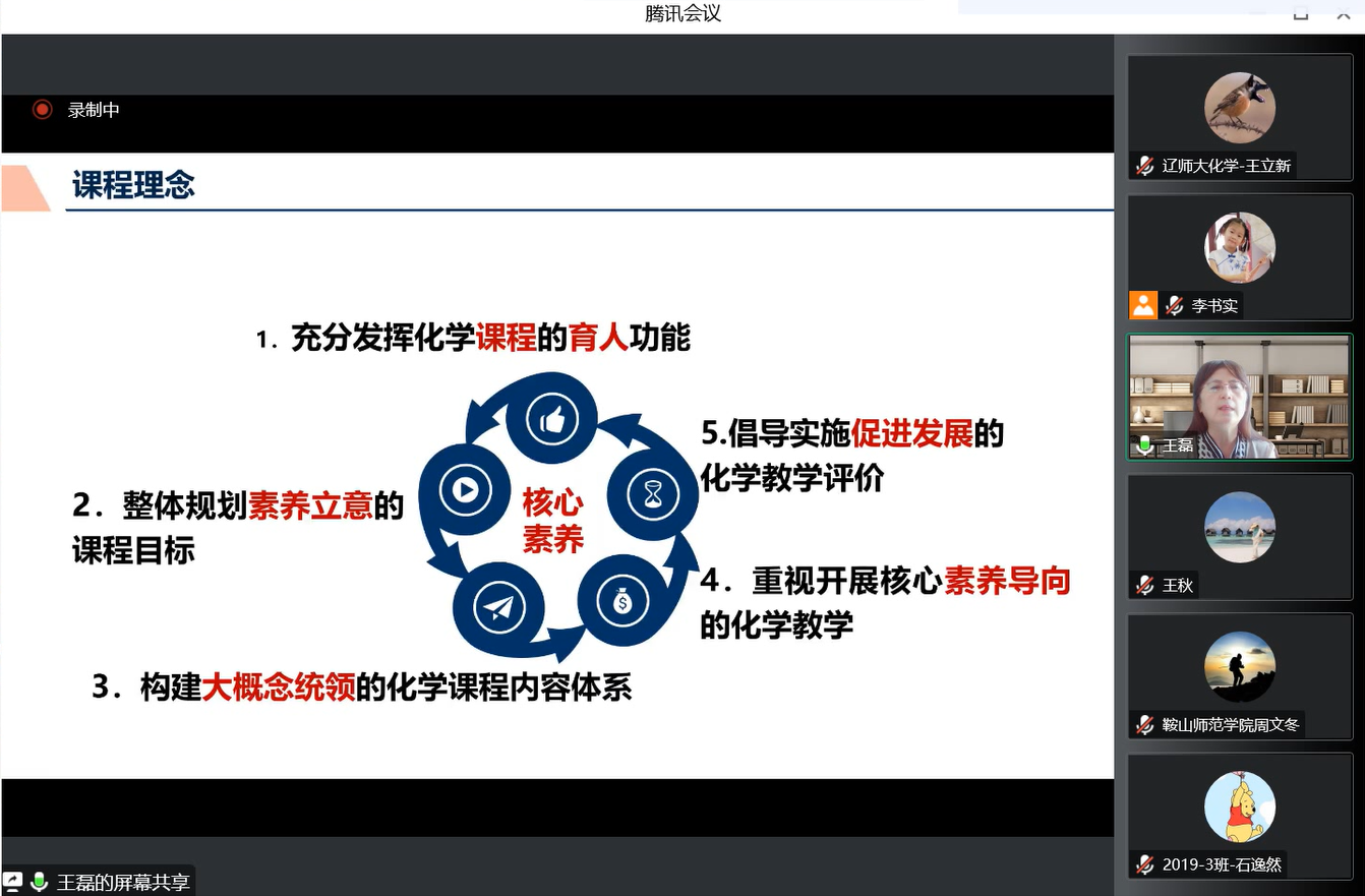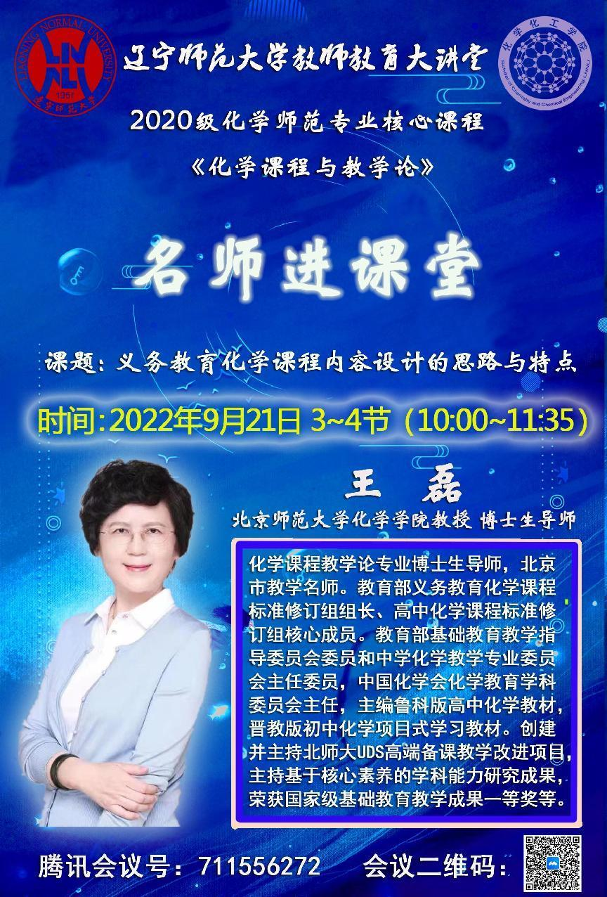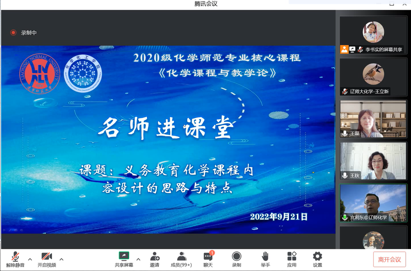 博士生导师王磊教授莅临我院化学(师范)专业核心课程《化学课程与教学论》的线上课堂,为2020级化学(师范)专业本科生以“义务教育化学课程内容设计的思路与特点”为题进行教学。