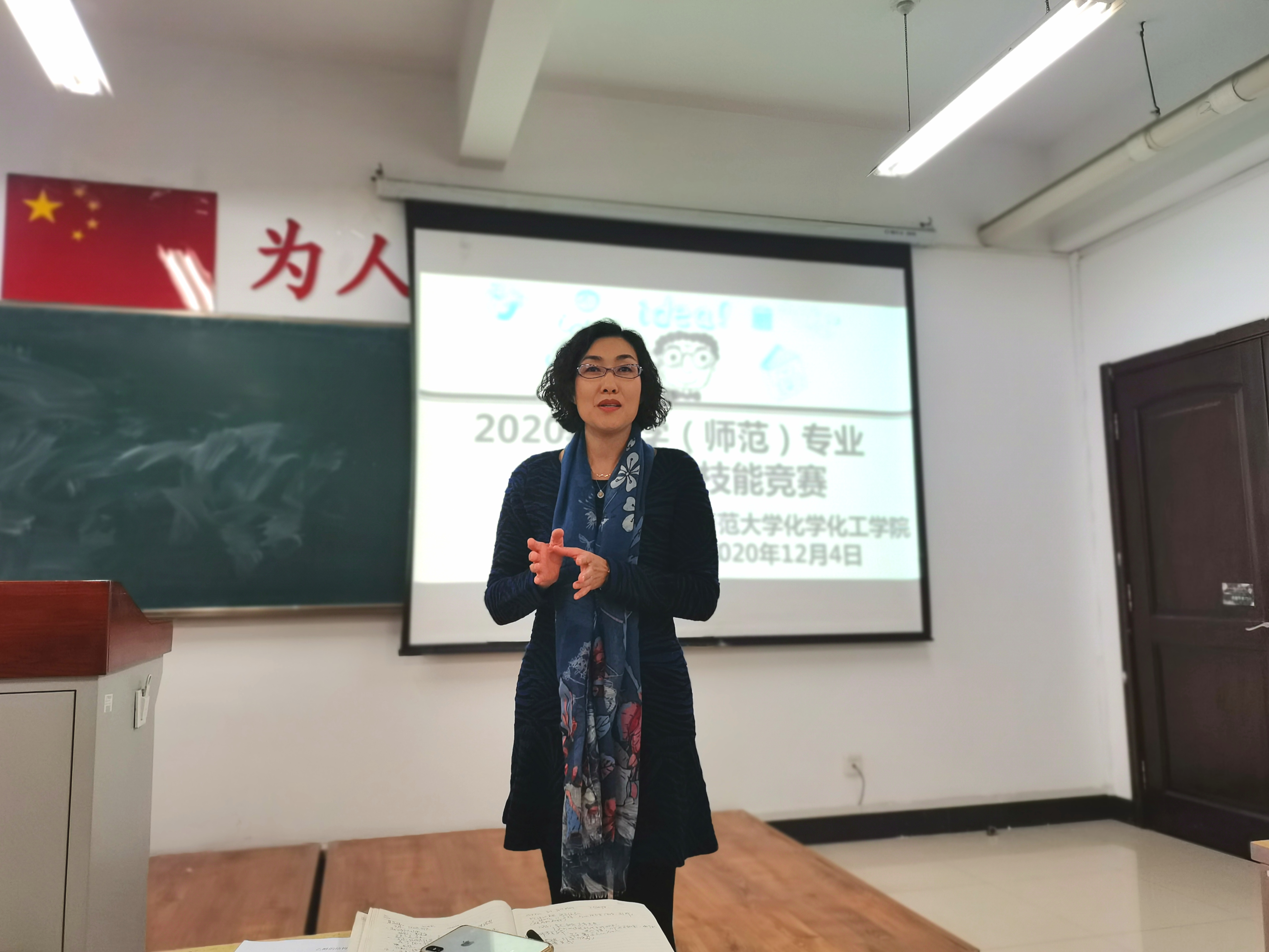 师范生的专业技能与实践创新能力,切实推进实践教学内涵向纵深发展,我院于12月4日下午在理化楼C411如期举行2020年化学(师范)专业本科生教学技能竞赛。大赛特邀大连育明高级中学唐永波老师和于欣老师两位基础教育名师进行现场指导,他们与我院化学教育研究所王秋、黄翠英、李书实、王立新四位老师共同担任大赛评委。我院副院长宫利东老师亲临现场观摩指导,2018级化学(师范)专业全体同学、2017级部分同学以及2020级部分硕士研究生共130余人全程观摩比赛。本次比赛由2018级姜奉奇同学主持。