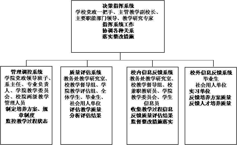 立足培养高素质复合型人才,确立了与本专业定位和人才培养目标相一致的质量标准,建立了一套由决策指挥系统、管理调控系统、质量评估系统、校内信息反馈系统和校外信息反馈系统组成的行之有效的教学管理机制,对培养方案制订、培养方案实施中的理论课教学、实验教学、集中实践、考试环节及毕业设计等各环节中的教师教学过程、学生学习过程、教学管理过程和毕业生质量等方面进行指挥决策、检查评价、信息反馈、整改调控。该管理机制组成及功能如下: