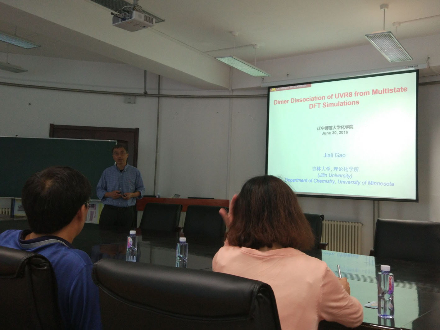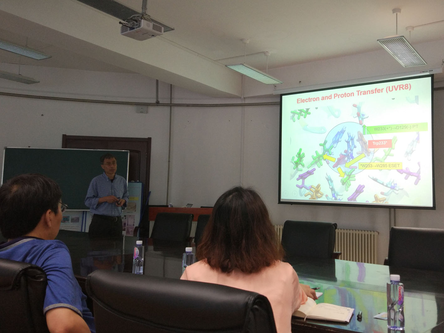 高加力教授介绍了多组态密度泛函理论 (Multistate DFT, MSFT)。该方法将多个可能存在的态进行线性组合,能够解决普通DFT方法计算激发态误差大的问题。该方法应用在探究UVR8蛋白在光激发前后聚合状态变化以及探究植物细胞中DNA受光破坏后自我修复等问题中,很好地模拟了实验结果。高加力教授的报告精彩纷呈、生动形象,与会师生就感兴趣的问题进行了提问。本次报告会对开阔我院师生的科研思路具有重要的启示作用。