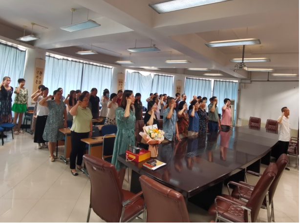 全体教职工齐聚一堂,为上半年退休的石雷、由万胜和荆延国三位党员教师举行荣退仪式。由于由万胜、荆延国老师不在大连本地,只有石雷老师参加了仪式。