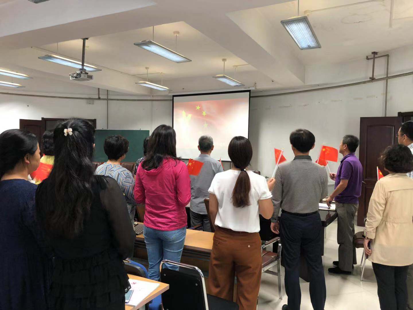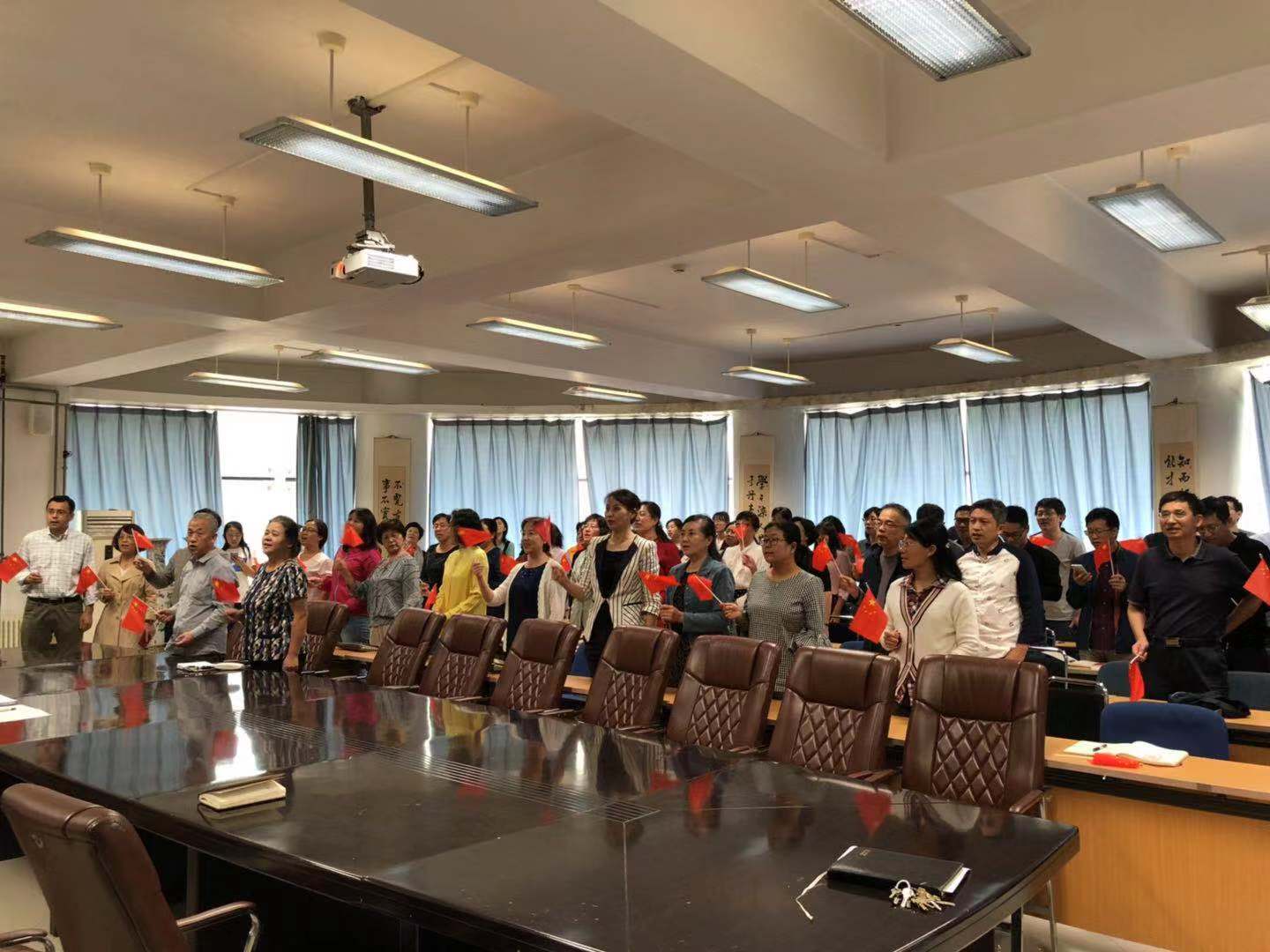为落实“不忘初心·牢记使命”主题教育工作,庆祝新中国国70周年华诞,9月20日下午14:00,在理化楼C区401会议室,足球分析论坛 全院教师手持国旗齐唱《歌唱祖国》。