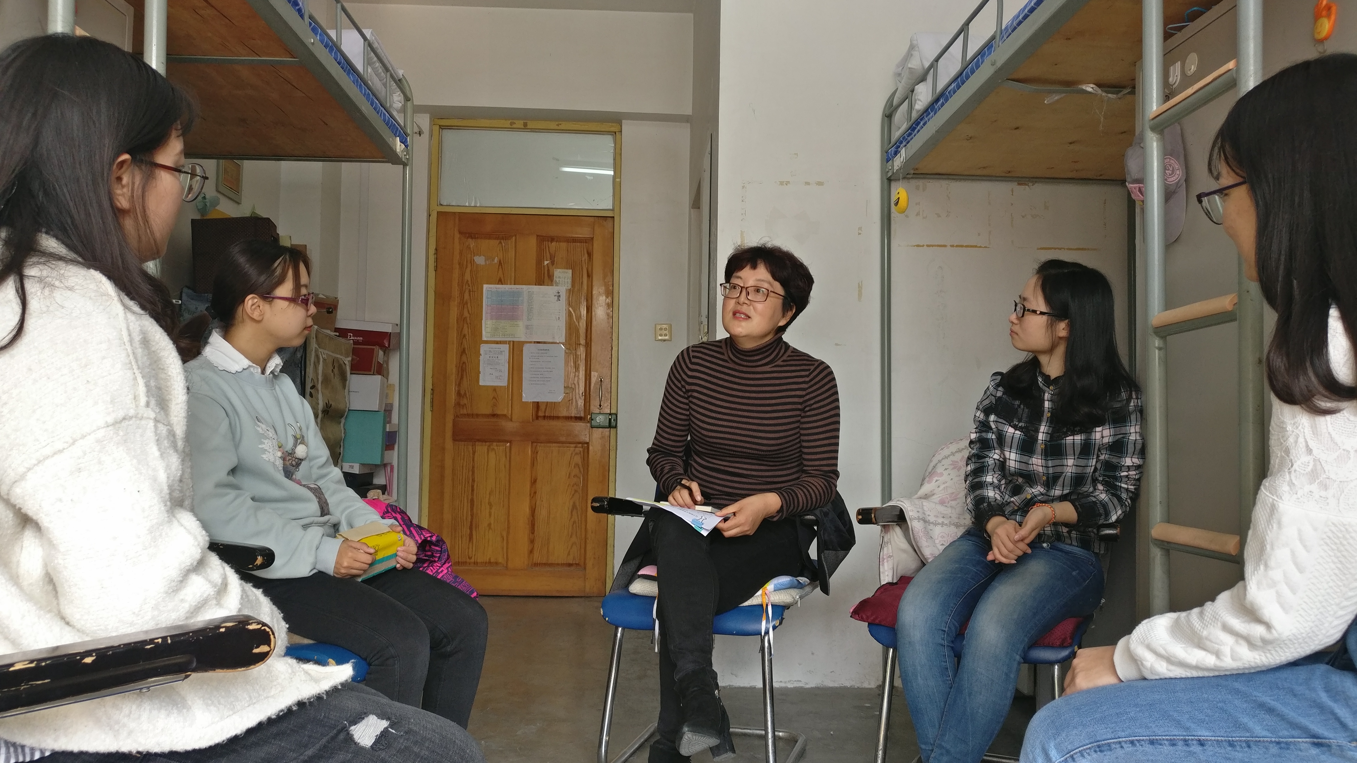 2017年10月25日上午,校纪委监察处副处级纪检员孙咏梅老师走进大学生公寓城三公寓508寝室,与2015级四名同学进行座谈交流。