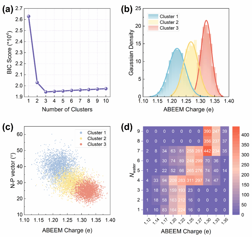 Figure 3(原文Figure 10)采用无监督机器学习方法,对ABEEM PFF模拟中脂质头基的电荷分布及其相关结构与界面性质进行了系统分析。首先通过BIC准则确定高斯混合模型的最优聚类数;其次显示对应电荷的高斯分布,不同聚类之间区分清晰;再将磷原子电荷与P-N法向量夹角进行联合分析,结果显示不同极化状态对应不同的头基构象分布,揭示了电荷浮动与分子构象之间的关联;磷原子电荷与界面水分子数目密切相关,说明极化效应对脂质膜-水界面结构具有重要调控作用。总体来看,ABEEM PFF结合无监督机器学习分析,能从复杂轨迹数据中识别具有物理意义的分子构象,为理解脂质膜体系中的电荷-构象-溶剂耦合机制提供了新的研究手段。