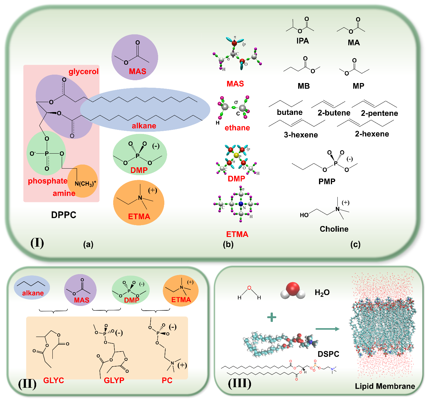 Figure 1(原文Figure 3)是该研究的流程图:(I)对于磷脂酰胆碱脂类,烷烃、烯烃和酯分别被用作模型化合物来表示脂肪族尾链、不饱和碳氢链和酯化甘油主链。经过参数优化和调节后,将确定的参数应用于具有相同官能团的分子。(Ⅱ)将优化后参数进一步应用于较大的模型化合物GLYC、GLYP和PC,验证其在官能团界面处的自由度。(Ⅲ)用CHARMM-GUI建立的脂双层,然后将最终参数用于脂双层体系的分子动力学模拟。